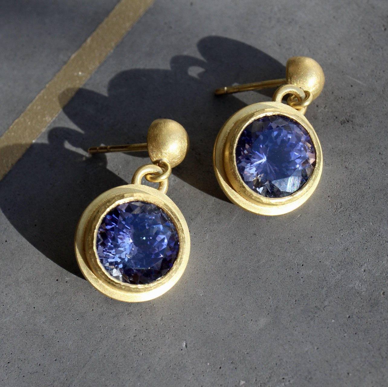 Diese perfekten Tansanite haben einen seltenen Durchmesser von satten 10mm, einen detailreichen Facettenschliff und diese unglaublich faszinierende Farbe: Electric Blue. Je nach Lichteinfall erscheint sie leicht Violett, mal intensiv Königsblau. Durch die zahlreichen Facetten kommen hier mehrere verschiedene Nuancen von Blau heraus, die klare Reinheit lässt die Steine lebendig funkeln, sodass sie beim Tragen auffällig hervorleuchten und Blicke auf sich ziehen. ( beim Probetragen wurde ich immer wieder darauf angesprochen wie toll die Farben aussehen )