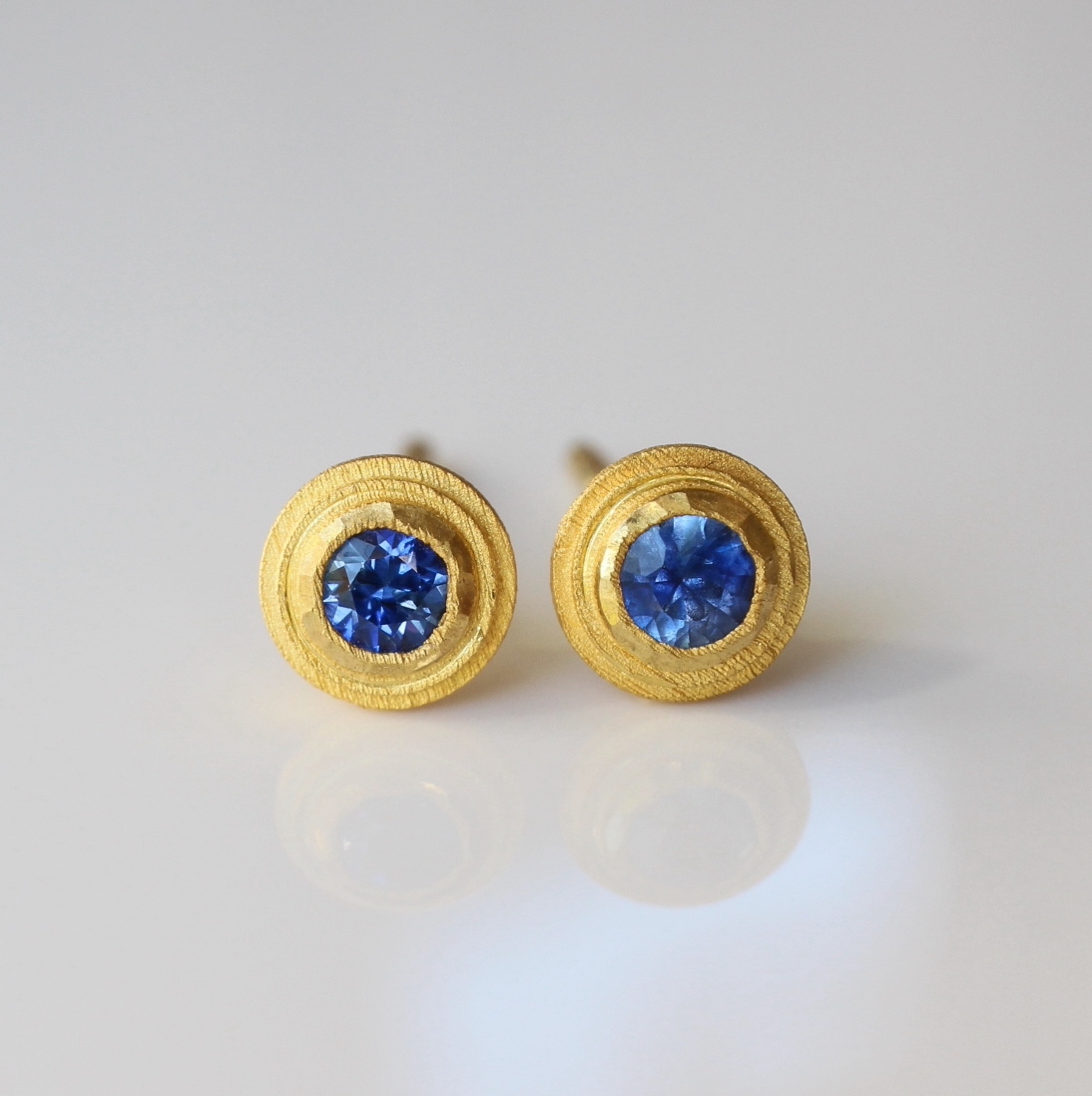 Diese Minis sind perfekt um Tag und Nacht im Ohr zu bleiben aber nicht zu langweilig wie sonst häufig so kleine Steckerchen. Die plastisch gearbeitete Fassung ist aus massivem warmgelbem 900er Gold gefertigt, ein sehr schönes Farbspiel mit den intensiv kornblumenblauen Saphiren.